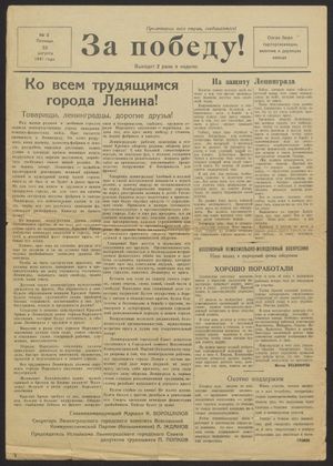 «За победу!» — орган бюро парторганизации, завкома и дирекции [Ленинградского изоляторного] завода [«Пролетарий»]. Выходила в начале Великой Отечественной войны вместо газеты «Пролетарий». Издавалась без названия завода и без выходных данных.